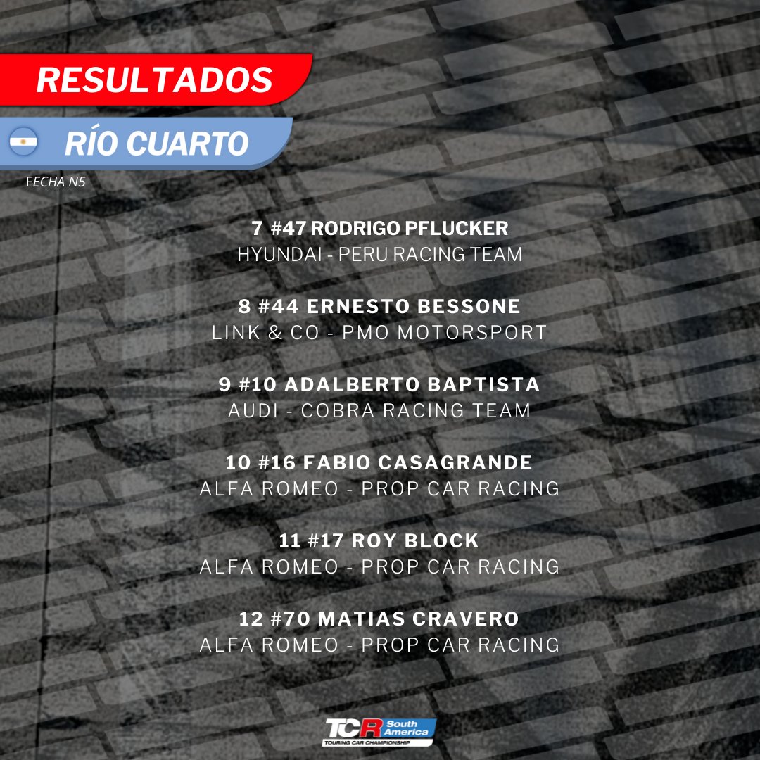 Cerraron el top ten Rodrigo Baptista (Audi), Rodrigo Pflucker (Hyundai), Ernesto Bessone (Lynn &CO), Adalberto Baptista (Audi) y Fabio Casagrande (Alfa Romeo).
